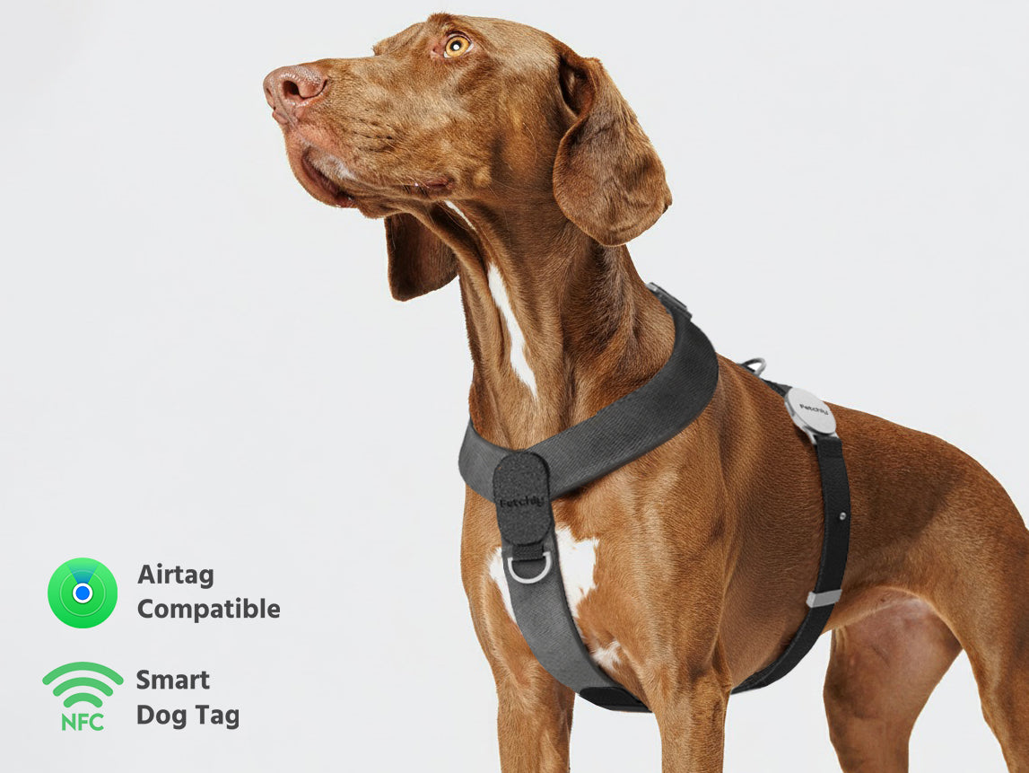 Old harnesses wear out, plastic clips break, and tracking feels uncertain. Fetchly’s smart harness combines a quick-release aluminum buckle, snap-on AirTag holder, and an NFC chip you control.
